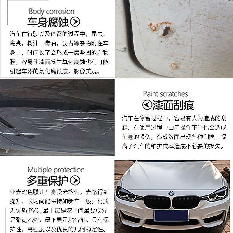产品特征:可拉伸,可移除,抗 UV,防腐蚀,防水,易清洁,易保养,保护车漆,抵御一般轻微性划痕、刮蹭,磨损等。