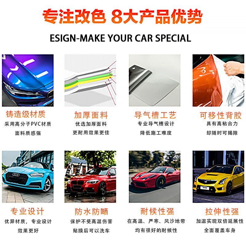 ESIGN的汽车改色膜产品采用高分子PVC材料铸造制成,胶水复合欧洲Rosh环保认证,改色膜带有高密度导气槽,导气效果好,易施工,粘贴牢固,揭除不留残胶不伤车漆,干贴施工不起泡,高达3-5倍延展性,拉伸不变色不断裂,耐高低温,抗UV,抗酸雨,全方位紧致贴合全车,不开裂,不翘边,宛如原漆效果,在不伤原车漆的前提下,随心所欲的改变车身颜色与涂装或拉花。颜色搭配自主性更强,且不会存在相同颜色不同部位产生色差的烦恼。如果想恢复原车漆,只需将贴膜揭掉即可。