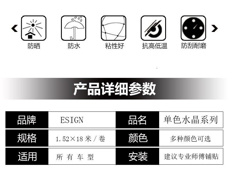 产品特征:可拉伸,可移除,抗 UV,防腐蚀,防水,易清洁,易保养,保护车漆,抵御一般轻微性划痕、刮蹭,磨损等。